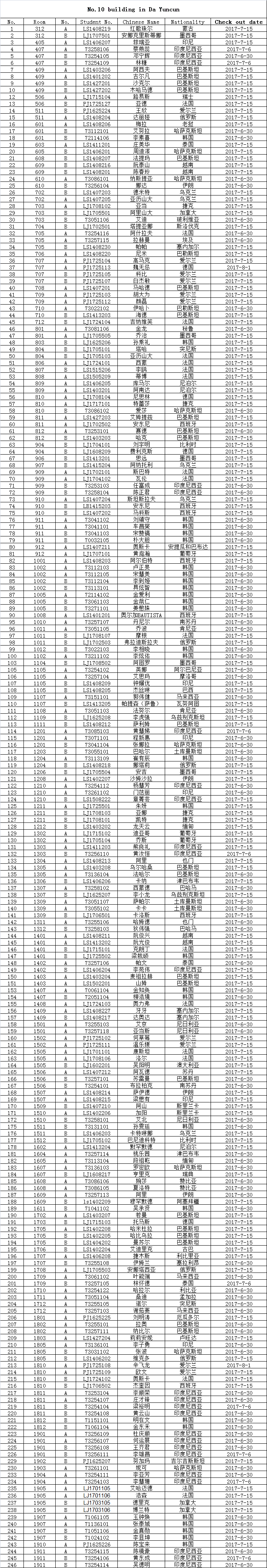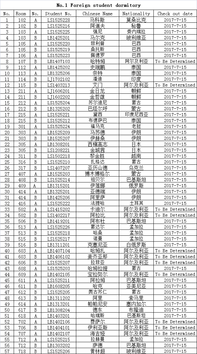 According to the “Notice on International Students Dormitories Adjustment in 2017 Summer Vacation(1)”, the following students are required check out the dormitory on time. the students who haven't check out on time , Your access card will be discontinued.